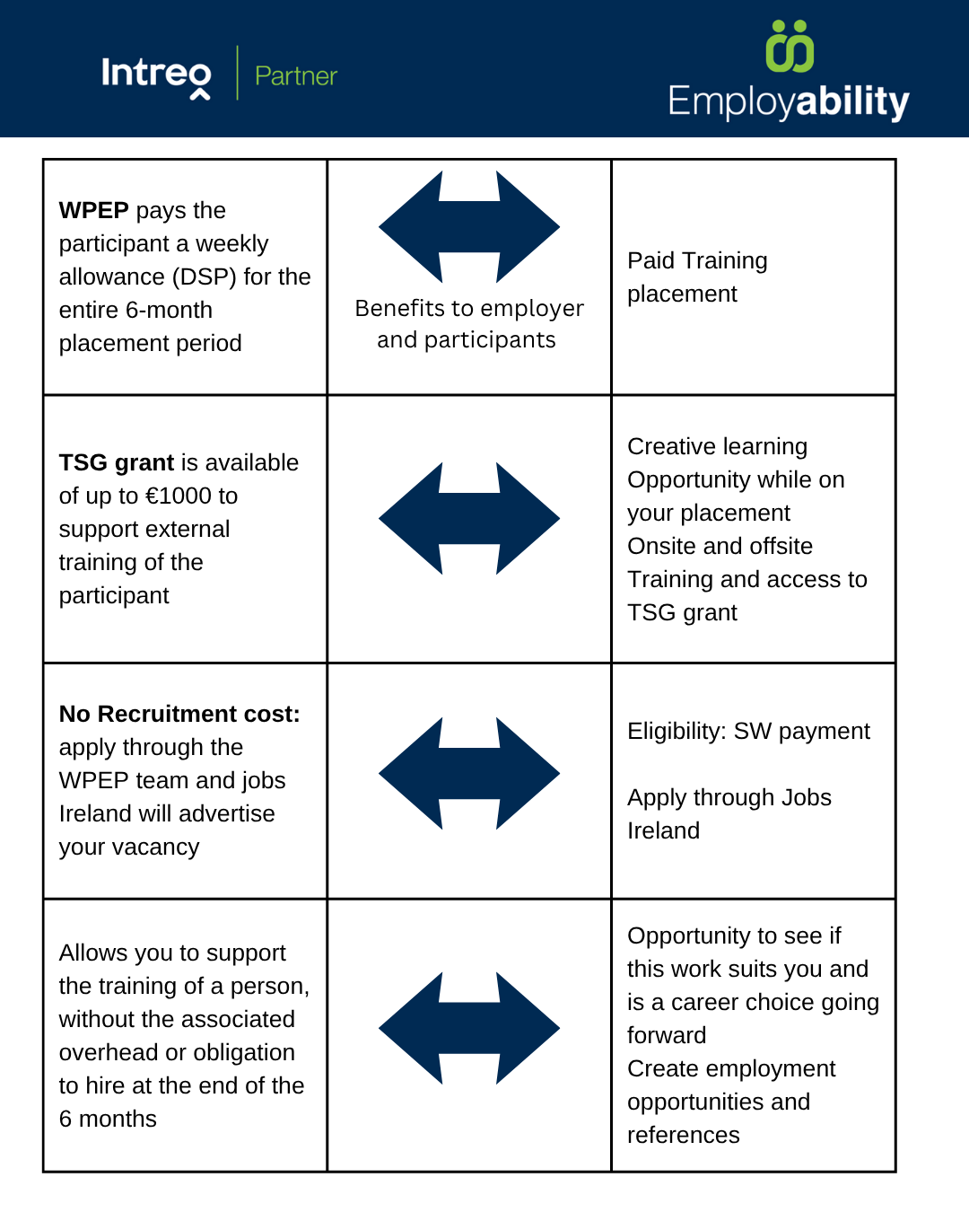 There is no cost to the host/employer; the participant will be paid by the Department of Social Protection during their work placement. The WPEP payment will be a minimum of €369 per week per participant.